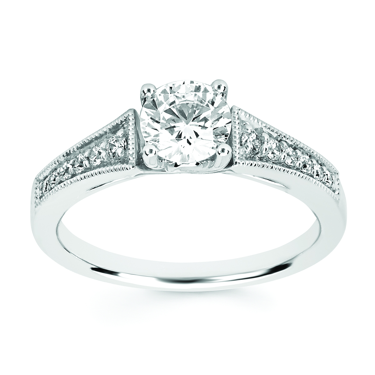 Engagement Ring Vintage Bridal: 1/8 Ctw. Diamond Semi Mount with Millgrain Detail shown with 3/4 Ct. Round Center Diamond in 14K Gold